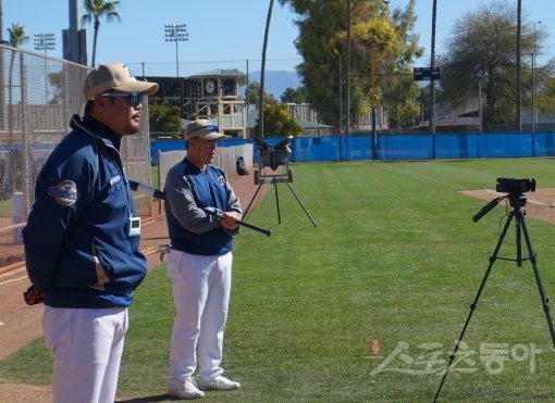 이호준 NC 타격코치가 8일(한국시간) 미국 애리조나주 투손의 에넥스필드에서 선수들의 훈련을 지켜보고 있다. 투손(미 애리조나주) | 최익래 기자