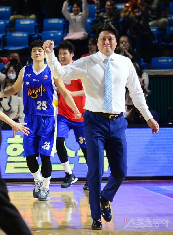 9일 서울 송파구 잠실학생체육관에서 열린 ‘2019-2020 현대모비스 프로농구’ 서울 SK와 서울 삼성의 경기에서 SK 문경은 감독이 승리에 주먹을 쥐고 있다.