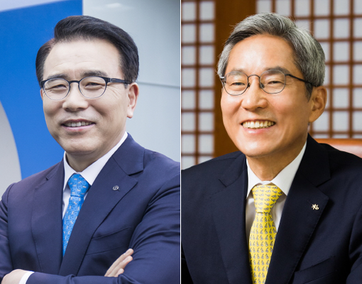 조용병 신한금융 회장(왼쪽)과 윤종규 KB금융 회장. 4대 금융지주사의 2019년 실적에서 신한금융이 KB금융을 제치고 1위를 지켰다. 2020년에도 리딩뱅크 자리를 놓고 양사의 치열한 경쟁이 예상된다. 사진제공|신한금융·KB금융