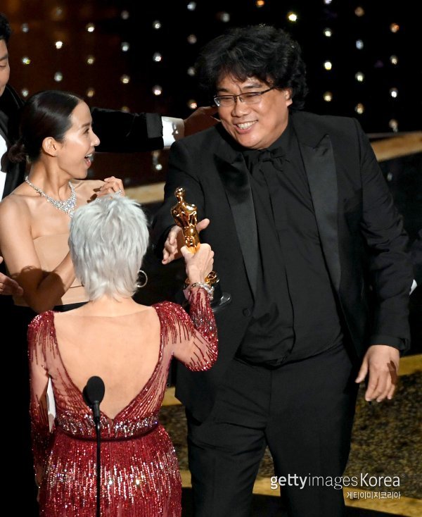 10일 오전(한국시간) 미국 LA돌비극장에서 열린 제92회 아카데미 시상식에서 최우수작품상 수상작으로 선정된 ‘기생충’의 봉준호 감독(오른쪽)이 배우 제인 폰다(오른쪽에서 두 번째 뒷모습)로부터 오스카 트로피를 건네 받으며 환호하고 있다. 조여정도 기뻐하고 있다. 사진=게티이미지코리아