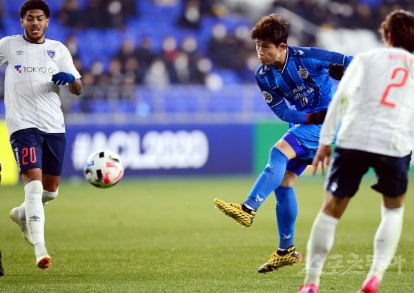 11일 울산 문수월드컵경기장에서 열린 ‘2020 아시아축구연맹(AFC) 챔피언스리그’ 울산 현대와 FC 도쿄(일본)의 조별예선경기에서 울산 이동경이 슛을 날리고 있다.