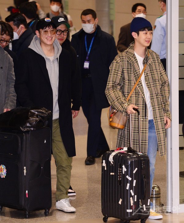 영화 ‘기생충’ 출연 배우들과 제작진이 12일 인천국제공항 제2터미널을 통해 미국 아카데미 영화 시상식을 마치고 귀국했다. 배우 이선균, 최우식이 입국장을 나오고 있다.