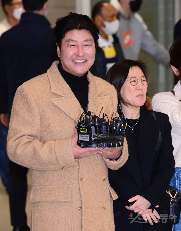영화 ‘기생충’ 출연 배우들과 제작진이 12일 인천국제공항 제2터미널을 통해 미국 아카데미 영화 시상식을 마치고 귀국했다. 배우 송강호가 소감을 말하고 있다.