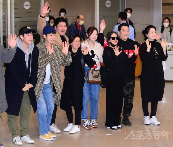 영화 ‘기생충’ 출연 배우들과 제작진이 12일 인천국제공항 제2터미널을 통해 미국 아카데미 영화 시상식을 마치고 귀국했다. 배우 이선균, 최우식, 송강호, 박소담, 제작사 곽신애 대표, 조여정, 박명훈, 장혜진(왼쪽부터)이 손을 흔들며 웃고 있다.