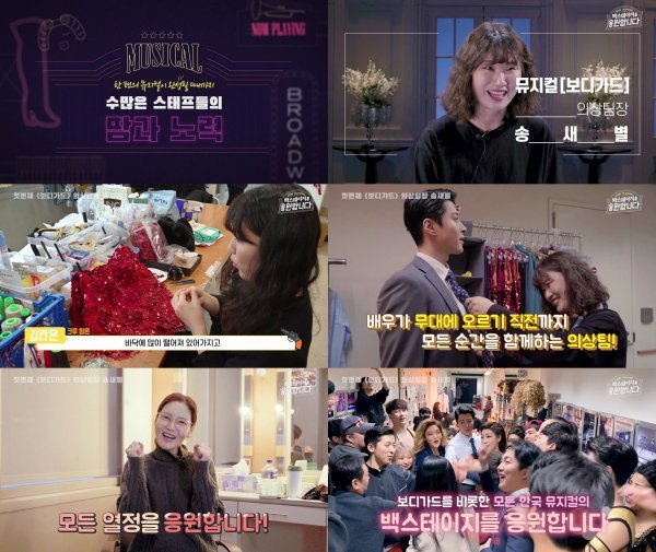 2020년 2월, 첫 선보인 ‘백스테이지를 응원합니다’ 캠페인은 뮤지컬 ‘보디가드’의 의상팀 송새별 의상팀장을 메인으로 공연 시작 전부터 종료 이후까지 무대 뒤 일과를 담았다. 뮤지컬 ‘보디가드’는 전 세계적으로 센세이션을 불러 일으킨 ‘휘트니 휴스턴’, ‘케빈 코스트너’ 주연의 동명 영화를 무대 위로 옮긴 작품이다. 전 세계가 사랑한 팝의 디바 ‘휘트니 휴스턴’의 전설적인 명곡 15곡을 더한 대표적인 주크박스 뮤지컬인 만큼, 눈을 뗄 수 없게 만드는 화려한 퍼포먼스가 관전 포인트다. 극중 팝스타의 다양한 무대 위 공연을 연출하기 위해 넘버 별 장르에 따른 각기 다른 의상이 준비된다. ‘레이첼 마론’ 캐릭터의 경우 총 17벌의 의상으로 20번에 가까이 체인지가 이뤄지며 가장 빠른 의상 전환은 단 15초만에 진행된다. 화려한 의상과 빠른 스타일 전환이 중요하기 때문에 소대 한 켠에 마련된 퀵 체인지룸에서 배우와 의상팀, 분장팀이 완벽한 호흡으로 팀워크를 발휘해야 한다.