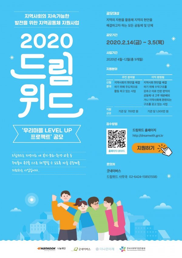 한국타이어앤테크놀로지의 사회공헌재단인 한국타이어나눔재단이 지역사회 내 주민참여 공동체 활동을 지원하는 ‘2020 드림위드 우리 마을 레벨업 프로젝트’ 공모를 14일부터터 3월 5일까지 실시한다. ‘