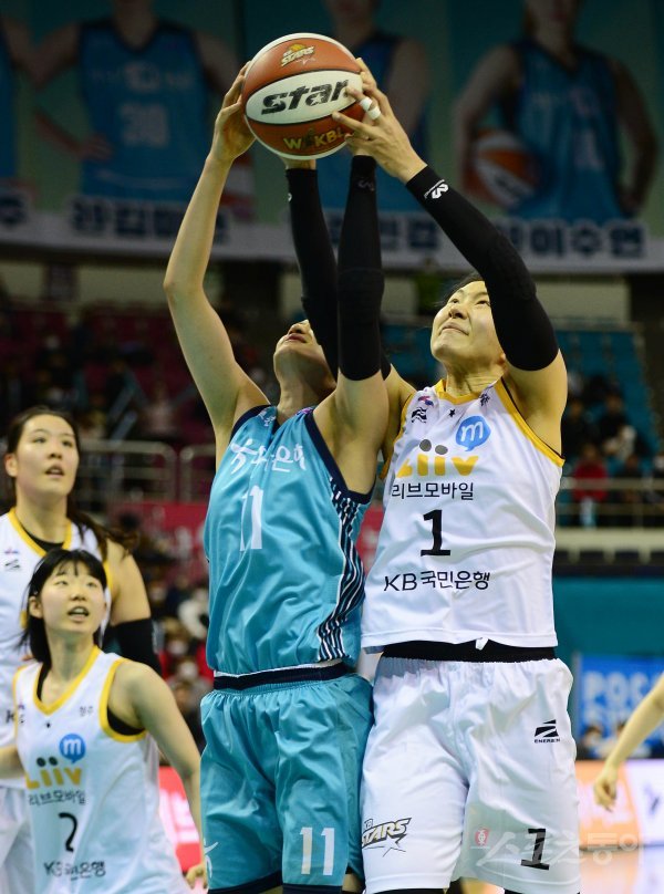 16일 경기도 부천체육관에서 열린 ‘하나원큐 2019-2020 여자프로농구‘ 부천 하나은행과 청주 KB의 경기에서 하나은행 강이슬(왼쪽)과 KB 염윤아가 리바운드 다툼을 벌이고 있다.