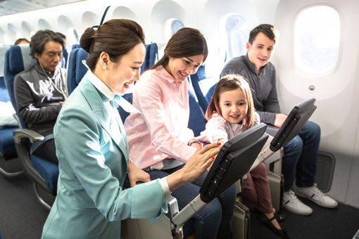 어린이 승객에게 기내 주문형오디오비디오(AVOD) 작동법을 알려주는 대한항공 승무원의 모습. 대한항공은 올해 안으로 기내 영화 콘텐츠를 400여 편으로 늘리는 등 기내 엔터테인먼트 서비스를 강화한다. 사진제공|대한항공