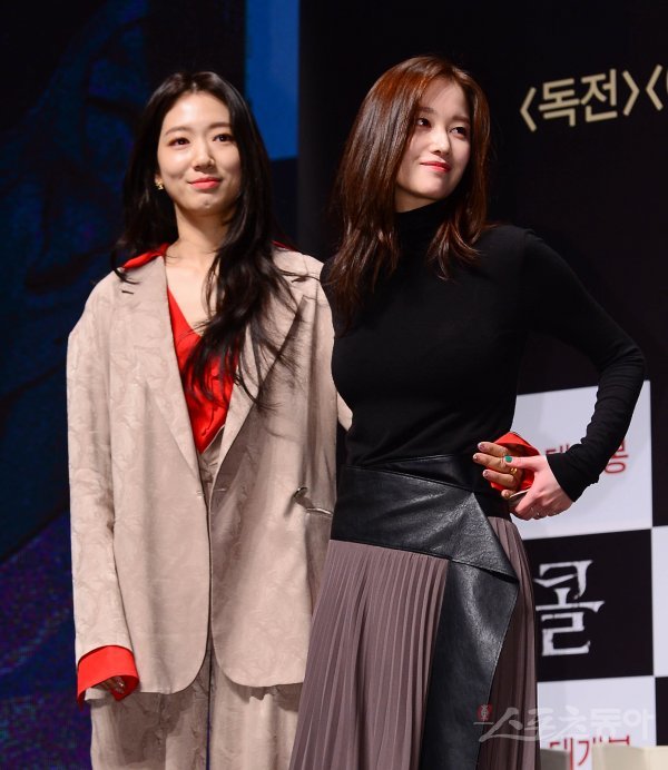 배우 박신혜(왼쪽)와 전종서가 17일 서울 강남구 신사동 CGV 압구정점에서 열린 영화 ‘콜’ 제작보고회에 참석해 허리를 감싸고 있다.