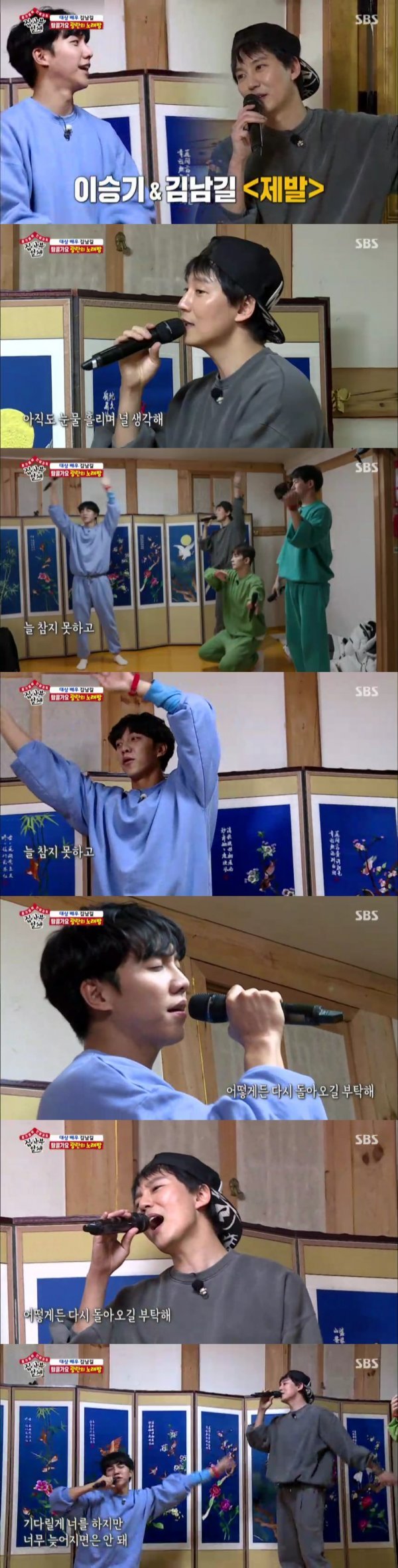 그러던 중 김남길은 평소 애창곡인 이소라의 ‘제발’을 선곡, 감미로운 목소리로 불러 감탄을 자아냈다. 이에 화답하듯 이승기가 노래를 이어 부르며 즉석에서 특급 듀엣 무대가 성사됐다. 두 사람은 호소력 짙은 목소리로 노래를 열창하며 시청자들의 시선을 사로잡았다.
