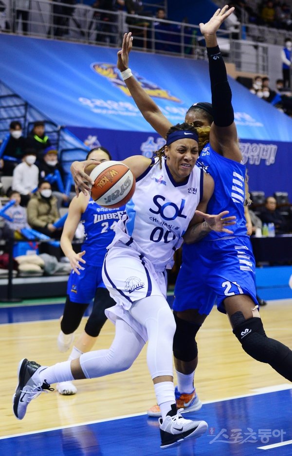 17일 충남 아산이순신체육관에서 열린 ‘하나원큐 2019-2020 여자프로농구‘ 아산 우리은행과 인천 신한은행의 경기에서 신한은행 서덜랜드가 드리블 돌파를 하고 있다.
