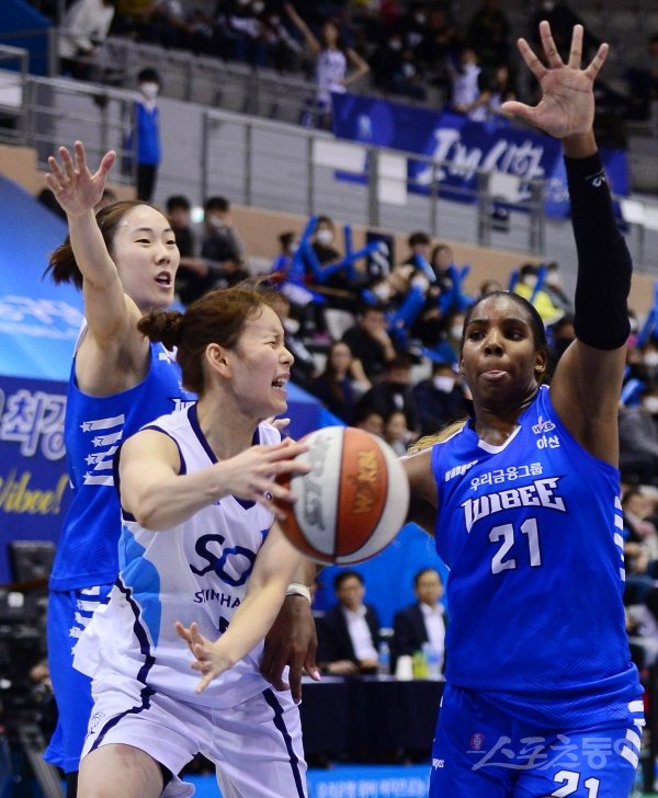 17일 충남 아산이순신체육관에서 열린 ‘하나원큐 2019-2020 여자프로농구‘ 아산 우리은행과 인천 신한은행의 경기에서 신한은행 김이슬(가운데)이 패스를 하고 있다.