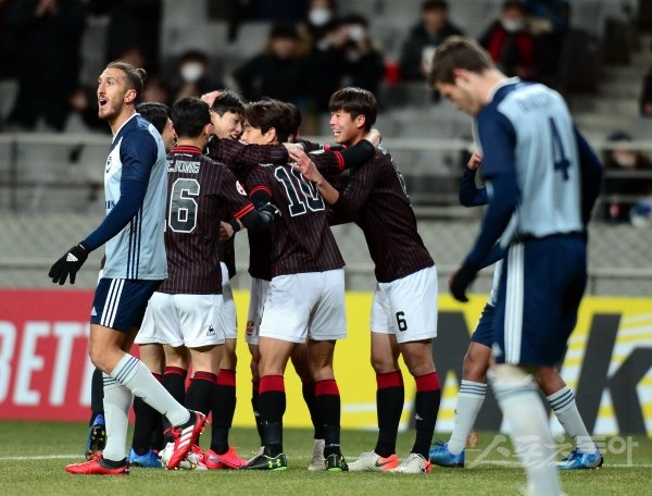 18일 서울월드컵경기장에서 열린 2020 ACL 조별리그 E조 1차전 FC서울과 멜버른 빅토리(호주) 경기에서 서울 박주영이 선제골을 성공시킨 후 동료들과 기뻐하고 있다.