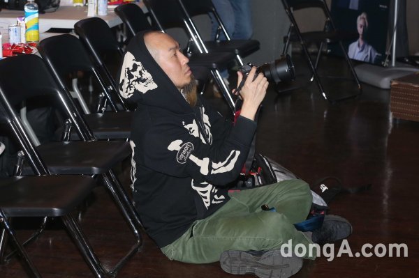 그룹 체리필터의 손스타가 19일 후 서울 마포구 홍대 롤링홀에서 열린 데뷔 싱글 앨범 \'COLOR MAGIC\' 발매 쇼케이스에 참석해 디코이 무대를 촬영하고 있다.