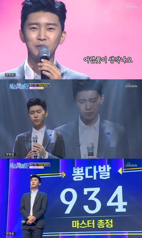 임영웅은 김광석의 ‘어느 60대 노부부 이야기’로 무대에 올랐다. 잔잔한 멜로디에 맞춰 짙은 감성을 녹여낸 가창력을 선보였고, 관객의 감동을 자아냈다. 김성주, 황윤성, 류지광은 눈물을 훔치기도 했다. 이에 장민호는 “짐 싸러 간다”며 패배를 예견해 웃음을 자아냈다.