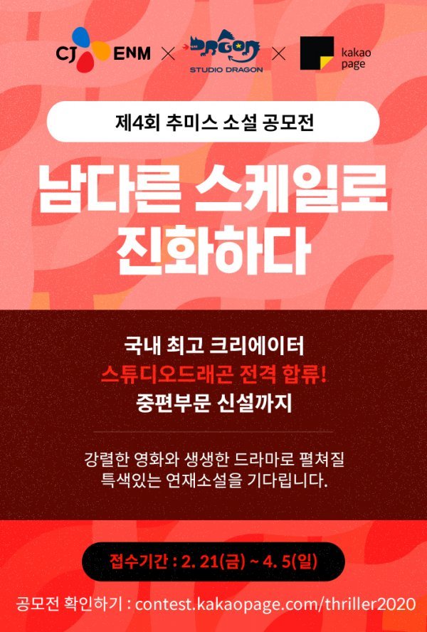 CJ ENM이 스튜디오드래곤, 카카오페이지와 손잡고 ‘제4회 추리, 미스터리, 스릴러 소설 공모전(이하 추미스 소설 공모전)’을 개최한다.