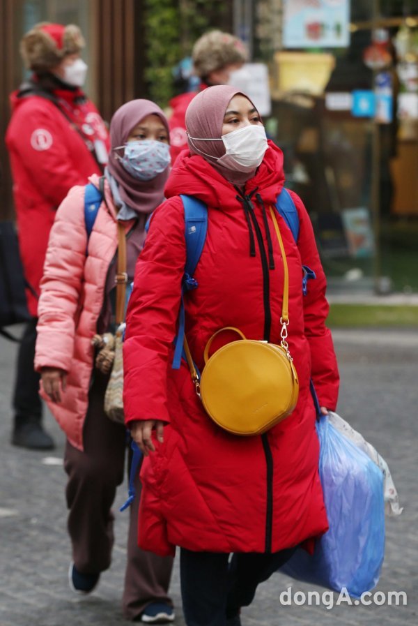 신종 코로나바이러스 감염증(코로나19) 확산되고 있는 21일 오후 서울 중구 명동 거리에서 외국인 관광객들이 마스크를 착용하고 있다.동아닷컴 국경원 기자 onecut@donga.com
