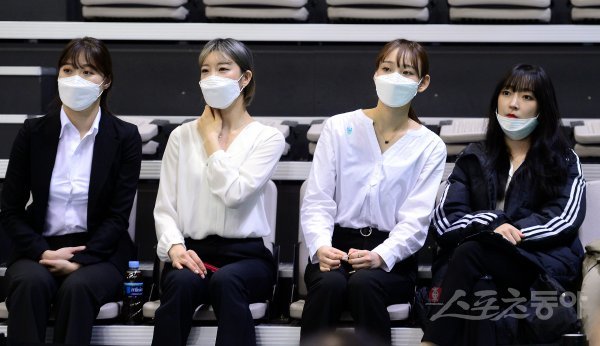 24일 충남 아산 이순신체육관에서 열린 ‘하나원큐 2019-2020 여자프로농구’ 아산 우리은행과 부천 하나은행의 여자부 경기에서 우리은행 치어리더가 마스크를 쓴채 경기를 지켜보고 있다.