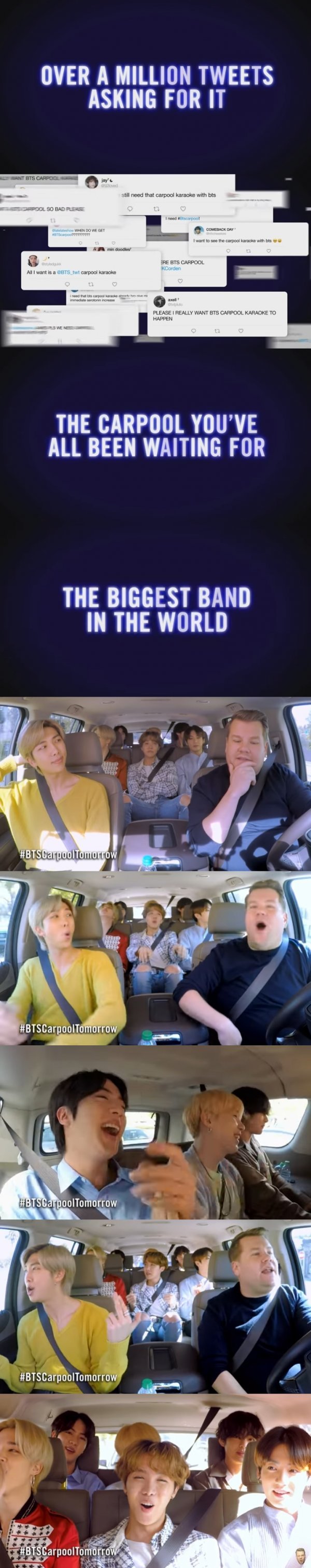 제임스 코든쇼 측은 예고 영상에서 “백 만개 이상의 출연 요청 트윗을 받았다”며 전 세계 아미들의 방탄소년단 출연 요청 트윗 일부를 공개했다. 이어 “세계에서 가장 거대한 밴드”라고 방탄소년단을 치켜세웠다.