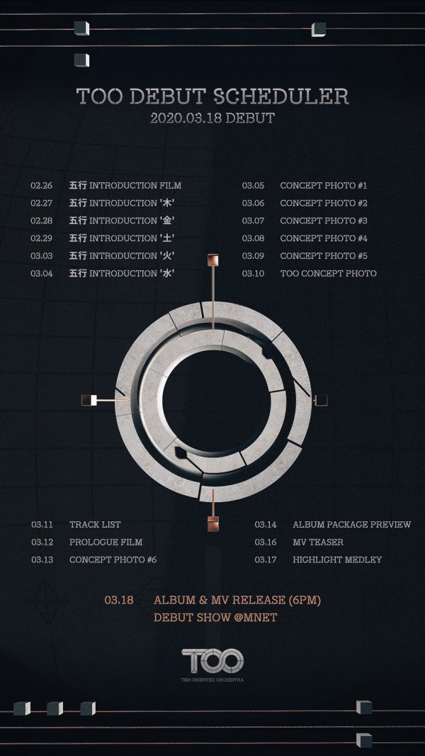 먼저 오는 26일 오행(五行) 인트로덕션 필름을 시작으로 우주 만물을 이루는 다섯 가지 원소, 즉 목(木), 금(金), 토(土), 화(火), 수(水)의 오행 프로모션이 베일을 벗는다. 이어 6가지 버전의 콘셉트 포토, TOO 단체 콘셉트 포토, 트랙리스트, 프롤로그 필름, 앨범 패키지 프리뷰, 뮤직비디오 티저, 하이라이트 메들리 등이 공개된다.