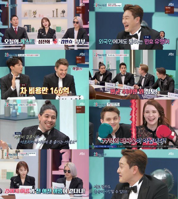 어제(24일) 밤 방송된 JTBC ‘77억의 사랑’(연출 강미소)에서는 MC 신동엽, 유인나, 김희철 그리고 7남 7녀들을 비롯 한국 대표로 결혼 10년차 개그맨 김원효, 심진화 부부가 참여, 다각 나라별 결혼에 대한 다채로운 이야기를 나눴다.
