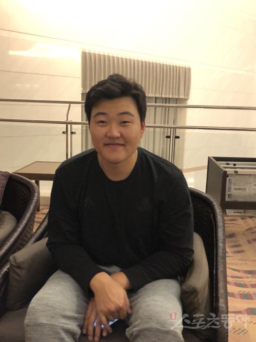 두산 오재일이 26일 선수단 숙소인 일본 미야자키 라그제히토츠바호텔에서 인터뷰를 마친 뒤 환하게 웃고 있다. 미야자키(일본) | 강산 기자 posterboy@donga.com