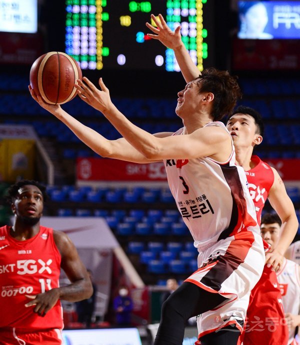 27일 서울 송파구 잠실학생체육관에서 열린 ‘2019-2020 현대모비스 프로농구’ 서울 SK와 부산 KT의 경기에서 KT 한희원이 수비수를 제치고 슛을 쏘고 있다. 잠실 | 주현희 기자 teth1147@donga.com