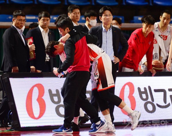 27일 서울 송파구 잠실학생체육관에서 열린 ‘2019-2020 현대모비스 프로농구’ 서울 SK와 부산 KT의 경기에서 KT 양홍석이 부상을 당한 뒤 코트에서 나가고 있다. 잠실 | 주현희 기자 teth1147@donga.com