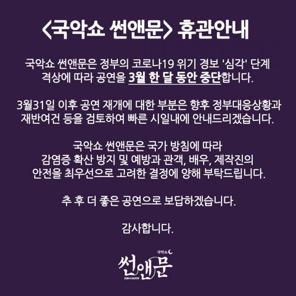 박칼린 연출의 국악쇼 썬앤문은 정부가 23일 코로나 19 위기 경보를 ‘심각’ 단계로 높임에 따라 공연을 3월31일까지 잠정 중단하기로 밝혔다.