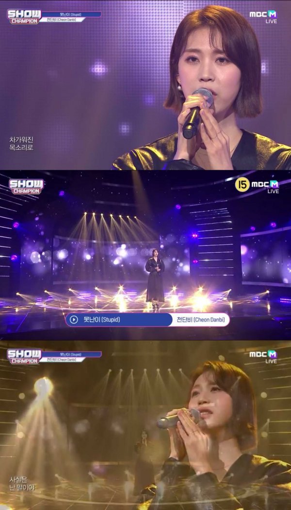 감성 발라더 천단비는 4일 ‘쇼!챔피언’에 출연해 신곡 ‘못난이’를 라이브로 선보였다.