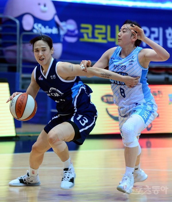 4일 인천 도원체육관에서 열린 ‘하나원큐 2019-2020 여자프로농구’ 인천 신한은행과 용인 삼성생명의 경기에서 신한은행 김단비가 삼성생명 이주연의 수비를 제치며 돌파하고 있다.