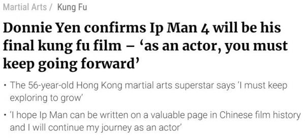 엽문 시리즈의 마지막 ‘엽문4: 더 파이널’의 견자단이 정통 액션 전격 은퇴 선언을 하며, 그의 액션을 볼 수 있는 마지막 기회에 팬들의 이목이 집중되고 있다.