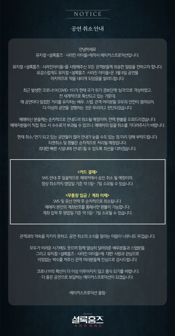 이어 “관객과의 약속을 지키지 못하고 공연 취소 소식을 알리게 되어 마음이 너무 무겁다. 모두가 어려운 시기에 웃으며 함께 열심히 달려와준 배우분들과 스태프 분들, 뮤지컬 ‘셜록홈즈 : 사라진 아이들’에 대한 사랑과 관심으로 아낌없는 박수를 쳐주신 관객 여러분들께 진심으로 감사드린다”라고 덧붙였다.