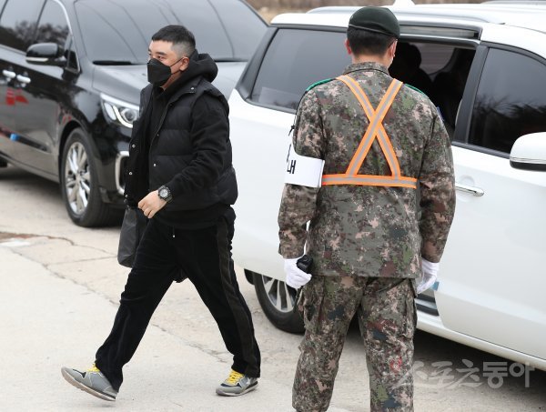 그룹 빅뱅 출신 가수 승리가 9일 강원도 철원군 육군 6사단 청성신병교육대에 차량에서 하차해 입대하고 있다.
