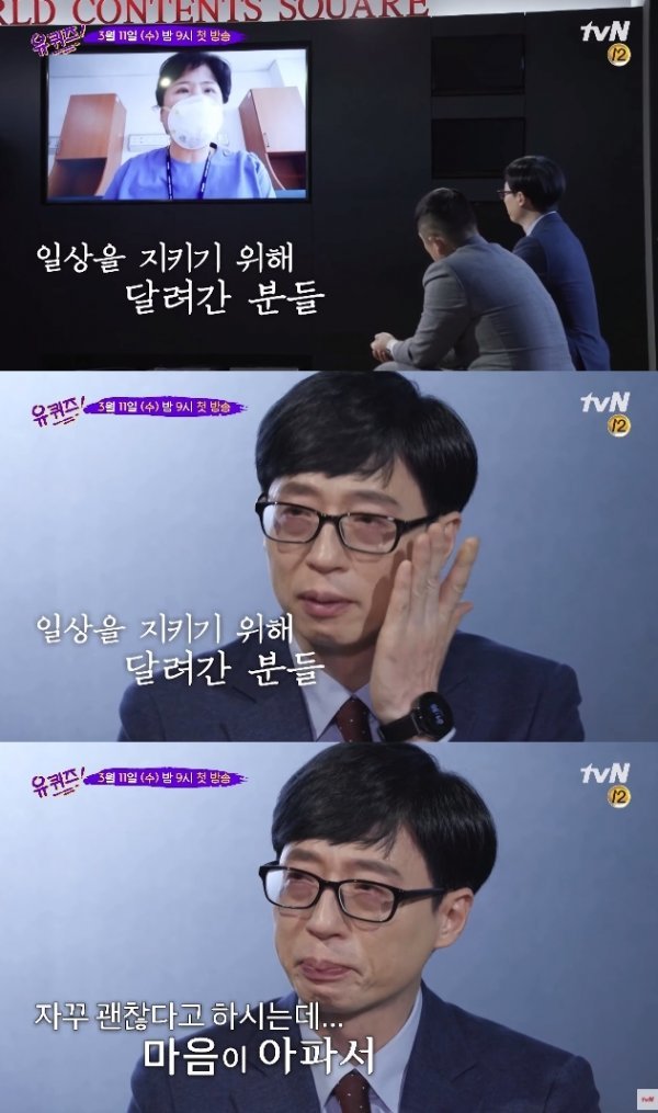 9일 tvN \'유퀴즈온더블럭\' 측은 코로나 19 환자들을 돕는 의료진과 화상으로 대화를 나누는 유재석, 조세호의 모습을 공개했다.