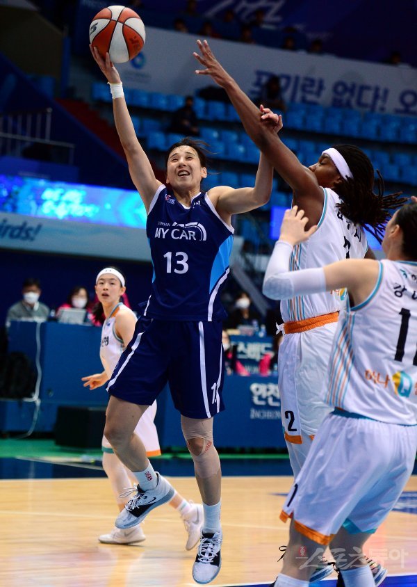 9일 인천 도원체육관에서 열린 ‘하나원큐 2019-2020 여자프로농구’ 인천 신한은행과 부천 하나은행 경기에서 신한은행 김단비가 하나은행 마이샤의 수비를 피해 슛을 쏘고 있다.