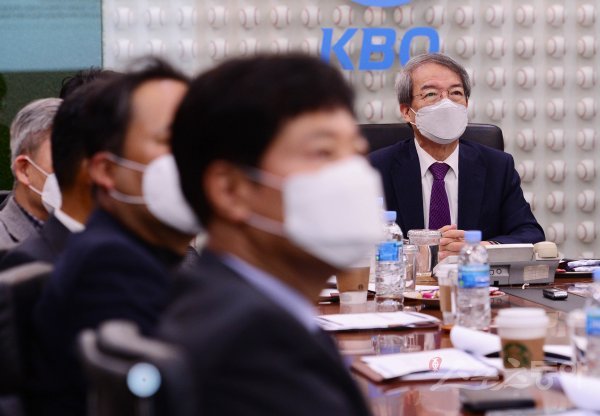 정운찬 KBO 총재와 프로야구 10개 구단 사장들이 10일 서울 서울 강남구 도곡동 KBO회관에서 이사회를 열고 정규리그 개막 일정 방안 논의 전 전병율 전 질병관리본부장에게 신종 코로나19 관련 브리핑을 듣고 있다.