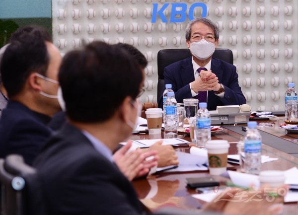 정운찬 KBO 총재가 10일 서울 서울 강남구 도곡동 KBO회관에서 이사회를 열고 전병율 전 질병관리본부장에게 신종 코로나19 관련 브리핑 후 박수치고 있다.