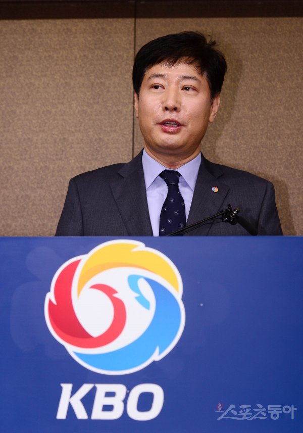 류대환 KBO 사무총장이 10일 서울 강남구 도곡동 KBO회관에서 열린 이사회에서 정규리그 개막 일정 연기 결정을 브리핑하고 있다.