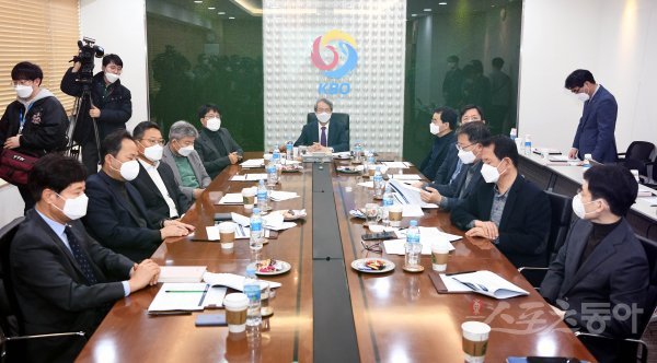KBO와 프로야구 10개 구단 사장들이 10일 서울 강남구 도곡동 KBO회관에서 이사회를 열고 정규리그 개막 일정 방안 논의 전 전병율 전 질병관리본부장에게 신종 코로나19 관련 브리핑을 듣고 있다. 주현희 기자 teth1147@donga.com