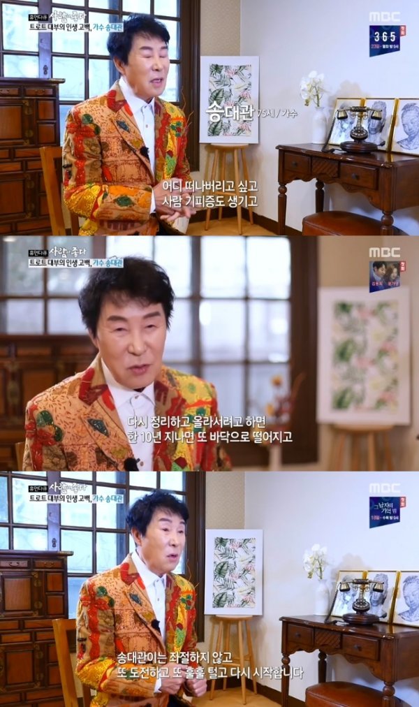 그는 이어 “다시 정리하고 올라서려고 하면 또 떨어지고, 또 10년 지나면 바닥으로 떨어지고 그러더라. 그래도 송대관은 좌절하지 않고 훌훌 털고 일어난다는 걸 보여주고 싶었다”고 전했다.