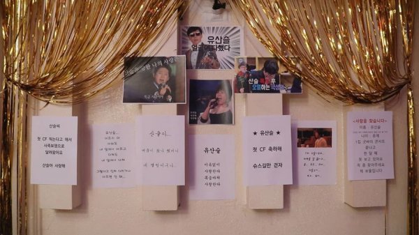 이어 유산슬의 1집 앨범 이미지가 박힌 8단 떡케이크도 웃음을 자아냈다. 특히 ‘슈스길만 걷게 해줄게’, ‘첫 CF라 사족보행으로 달려왔다’며 유산슬에 대한 부담스러운 애정을 드러낸 메시지도 포착돼 눈길을 끌었다.