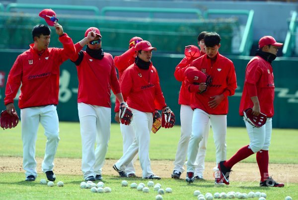 12일 인천 SK행복드림구장에서 SK가 스프링캠프를 마치고 국내 훈련을 가졌다. SK 내야수들이 수비 훈련을 마치고 인사를 하고 있다.