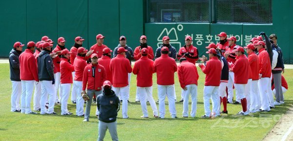 12일 인천 SK행복드림구장에서 SK가 스프링캠프를 마치고 국내 훈련을 가졌다. SK 선수들이 박수를 치며 훈련에 나서고 있다.