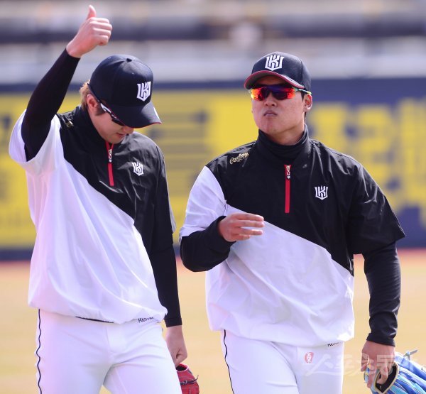 12일 경기도 수원kt위즈파크에서 kt 위즈가 훈련을 시작했다. kt 김민혁이 강백호와 수비 훈련을 마치고 엄지를 치켜올리고 있다.