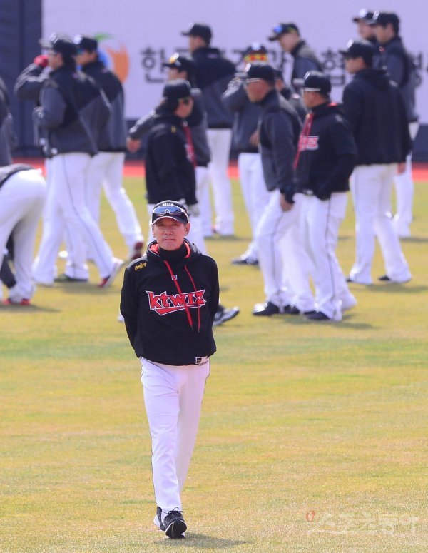 12일 경기도 수원kt위즈파크에서 kt 위즈가 훈련을 시작했다. kt 이강철 감독이 선수들에게 훈련을 지시한 뒤 돌아서고 있다.