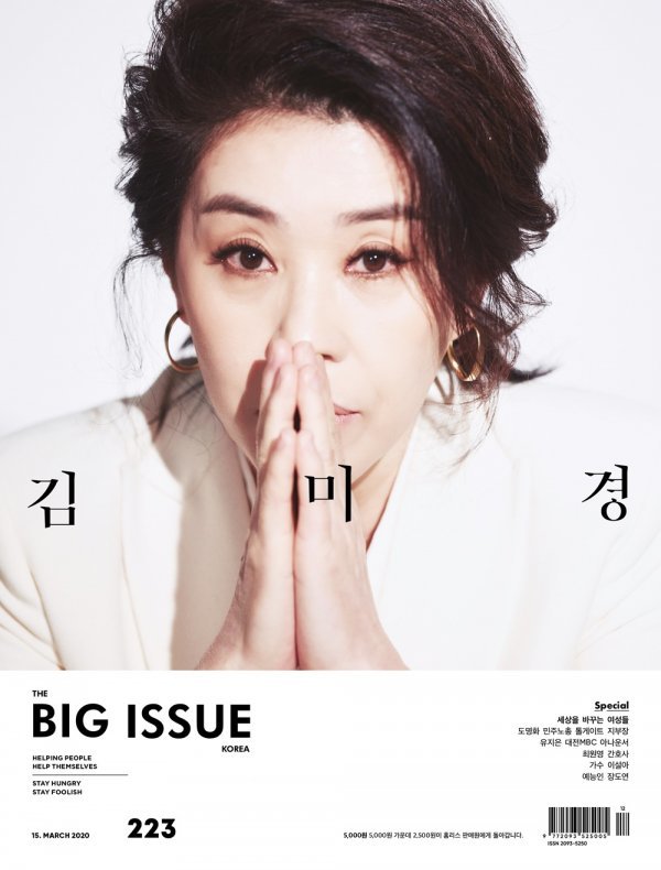 3월 8일 세계 여성의 날을 기념해 격주간 매거진 ‘빅이슈’ 223호(3월 13일 발행)의 표지를, tvN 드라마 ‘하이바이, 마마!’에 출연 중인 배우 김미경이 장식했다.