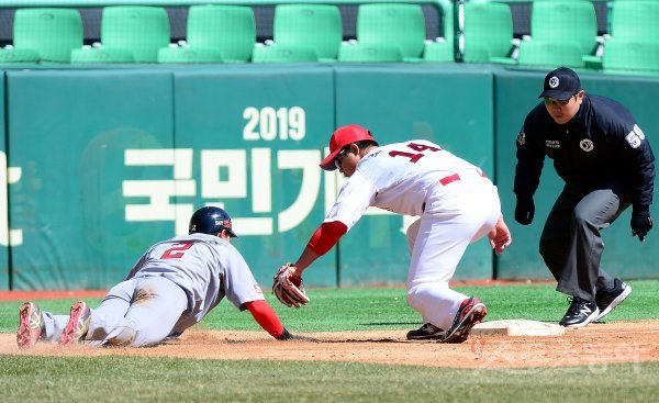 16일 인천 SK행복드림구장에서 SK 와이번스의 청백전 경기가 열렸다. 4회초 1사 2, 3루에서 3루 주자 유서준이 최정에게 견제 아웃되고 있다.