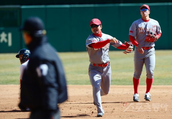16일 인천 SK행복드림구장에서 SK 와이번스의 청백전 경기가 열렸다. 2회말 무사 1루에서 SK 김성현이 이재원의 타구를 병살로 아웃시키고 있다.