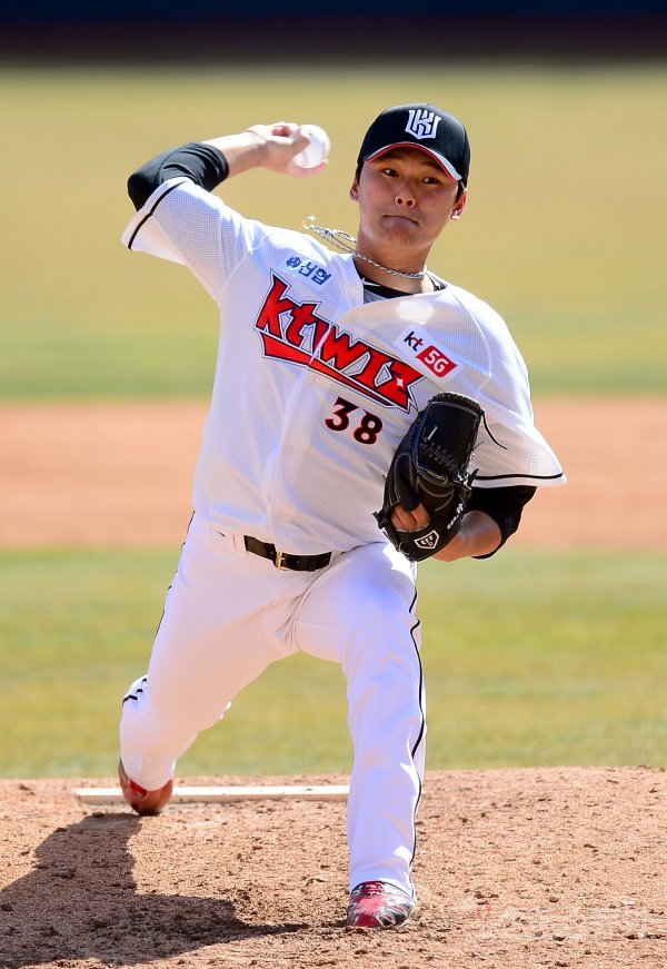 프로야구 개막이 4월 중으로 잠정연기된 가운데 KT가 16일 수원KT위즈파크에서 자체 청백전을 가졌다. 교체 등판한 빅(홈)팀 주권이 역투하고 있다.